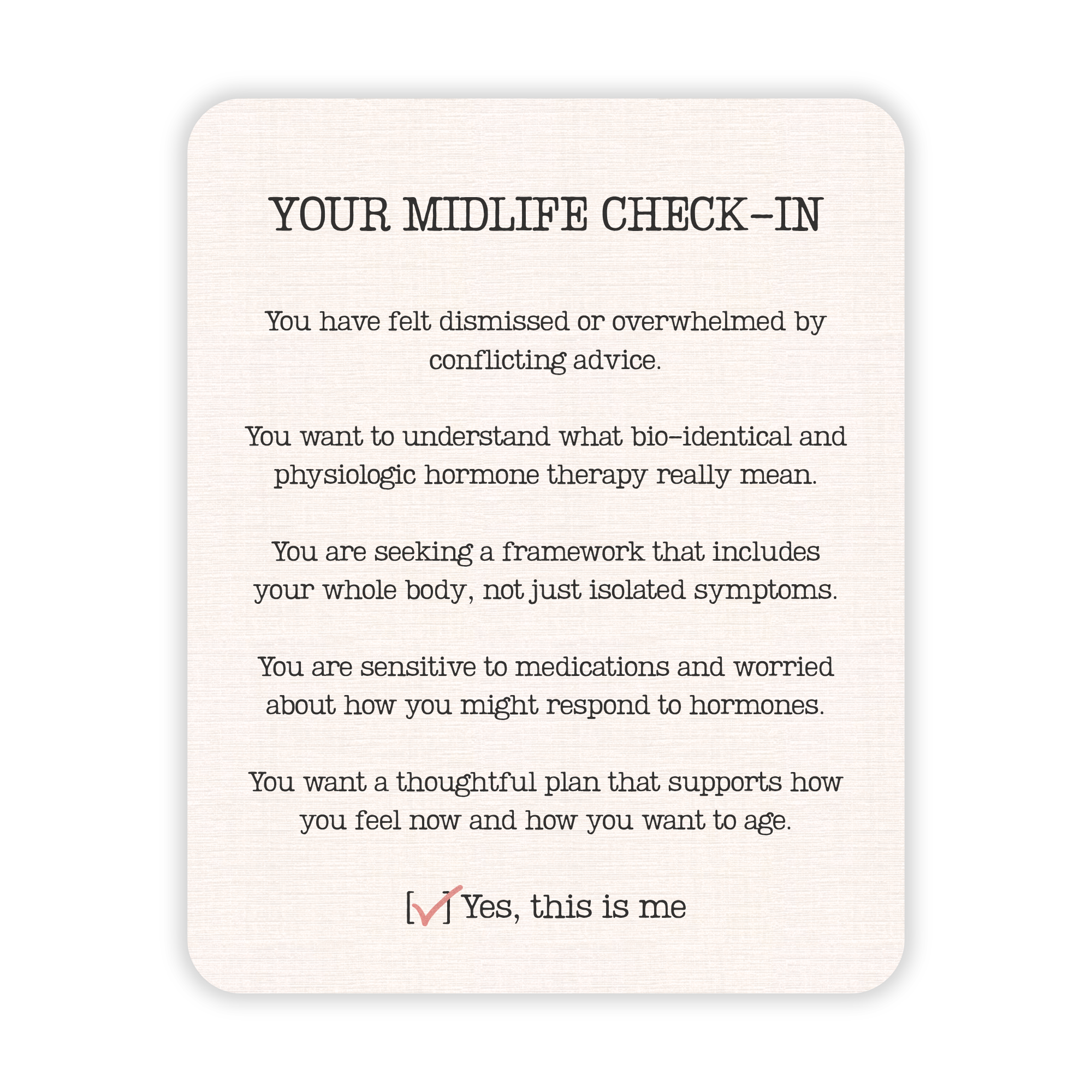 Perimenopause is a critical window. Hormonal changes can begin years before the final menstrual period. Symptoms such as irregular cycles, sleep disturbance, mood shifts, and metabolic changes are common. Too often, these are dismissed or treated with birth control or antidepressants. We will discuss why this stage is essential to address proactively, and how hormone therapy may or may not fit into your care at this time.
